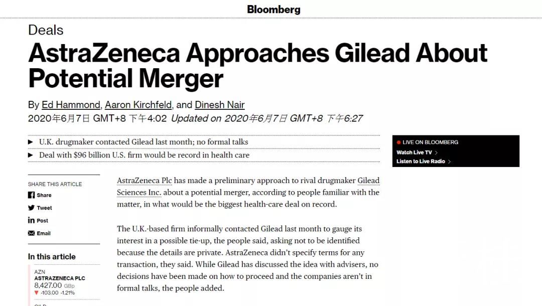 知情人士表示,阿斯利康上個(gè)月聯(lián)系了吉利德,以尋求可能的合作。知情人士補(bǔ)充說(shuō),盡管吉利德公司已經(jīng)與財(cái)務(wù)顧問(wèn)討論了這個(gè)想法,但目前還尚未決定,兩家公司也沒(méi)有進(jìn)行正式談判。目前無(wú)法聯(lián)系到吉利德公司的發(fā)言人。阿斯利康的發(fā)言人未對(duì)“這個(gè)消息”發(fā)表評(píng)論。