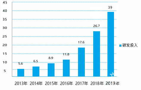 2019年公司累計投入研發資金39億元,比上年同期增長45.9%,研發投入占銷售收入的比重達到16.7%。