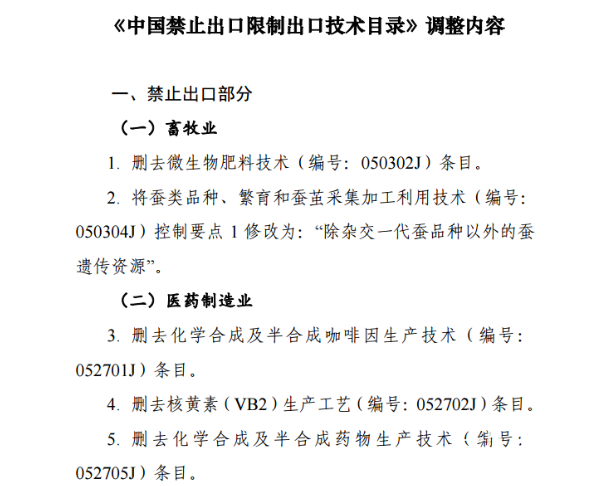 8月28日,商務部、科技部發布《中國禁止出口限制出口技術目錄》,其中對醫藥制造業做了如下規定: