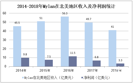 不僅僅是TEVA,從Mylan的財報中也可以看出其美國仿制藥業務近年來開始承受到較大的業績壓力。2017、2018年Mylan在北美地區收入和利潤連續兩年呈現下滑態勢。2018年Mylan在北美洲營收41億美元,凈利潤3.3億美元。
