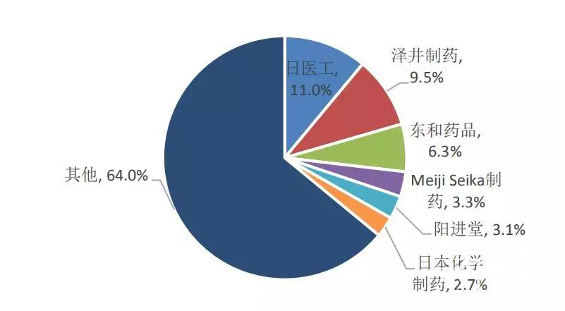 日本仿制藥企業的數量在近十年維持在30家左右的水平。其中,2016年日本以仿制藥為主業的藥企達到32家,占處方藥企業數量的30%左右,占日本所有藥企數量的11%。從市場份額上看,前六大領軍企業日醫工、澤井制藥、東和藥品、Meiji Seika制藥、陽進堂和日本化學制藥合計占據了36%左右的市場份額