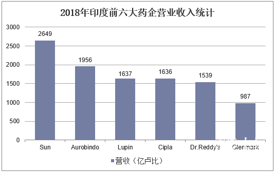 從印度的前六大藥企營收來看,Sun、Aurobindo、Lupin、Cipla、DrReddy’s和Glenmark2018年合計銷售額達到10404億盧比,約合151億美元,約合人民幣1040億元,最大的Sun的銷售額達到265億元。