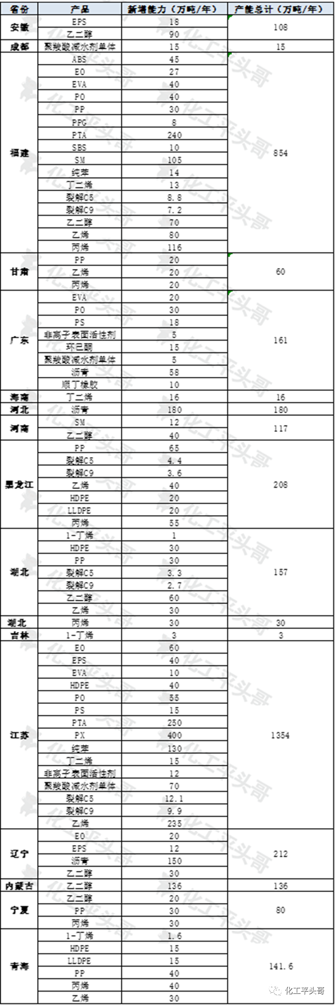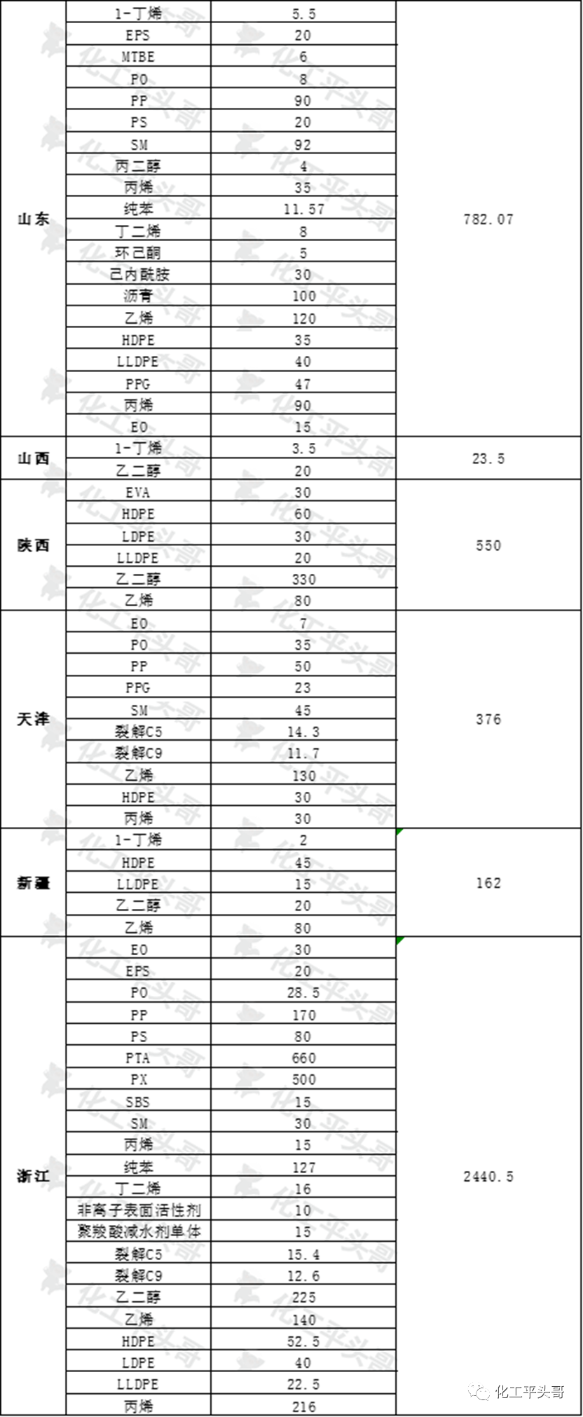 另外,江蘇省在2021年也有較大規模的項目投產,其中包括盛虹煉化一體化、佳化化學等項目,其中盛虹煉化一體化項目,將是江蘇省在2021年投產規模最大的化工項目,也將會帶動江蘇省數十種化工品的生產和銷售。