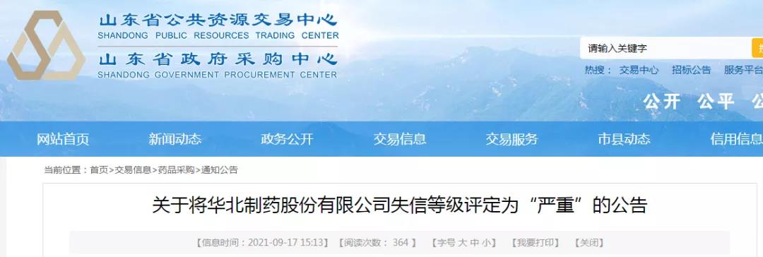 2021年9月17日,山東省公共資源交易中心發布關于將華北制藥股份有限公司失信等級評定為“嚴重”的公告。