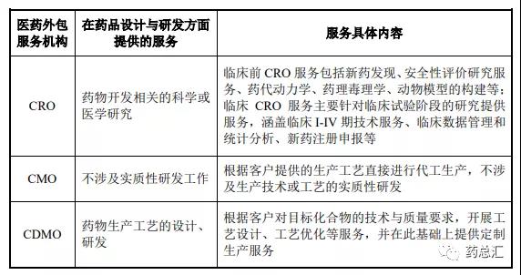 近年來,全球醫藥行業的競爭日趨激烈,制藥產業鏈中的分工日益細化,醫藥行業的專業化外包已成為制藥企業的重要戰略選擇。隨著醫藥外包服務機構專業化程度的不斷提高, 醫藥外包服務的內容逐漸涵蓋了從疾病目標研究、藥物化合物篩選、臨床試驗服務、工藝研發、規模化生產直至市場銷售的各環節。根據所提供服務的內容劃分, 醫藥外包服務機構主要包括 CRO、CMO、CDMO 企業等。