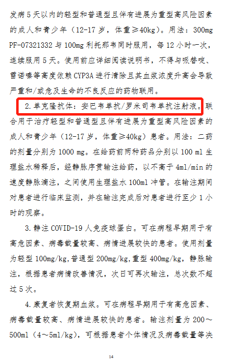 除中成藥外,新版診療方案將國家藥監(jiān)局批準(zhǔn)的兩種特異性抗新冠病毒藥物納入,即利托那韋片(Paxlovid)和安巴韋單抗/羅米司韋單抗注射液。