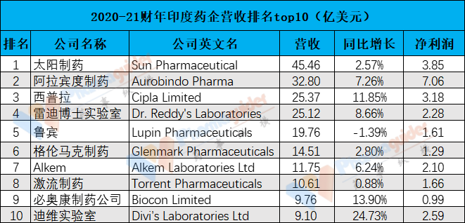 去年凈利潤為3.85億美元。第二名是阿拉賓度制藥,21年營收32.8億美元,同比增長7%,凈利潤7億美元。第三名是西普拉,去年營收25.37億美元,同比增長11.85%,凈利潤3.18億美元。Top8營收在10億美元以上。