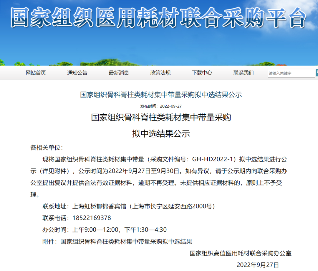 9月27日,國家組織骨科脊柱類耗材集中帶量采購在上海接受企業遞交申報材料并現場開標。晚間,國家組織高值醫用耗材聯合采購辦公室官宣國家組織骨科脊柱類耗材集中帶量采購擬中選結果(詳見文末表格)。