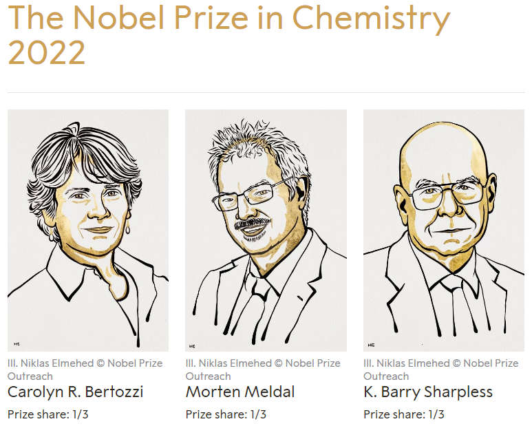 2022年諾貝爾化學獎被授予Carolyn R. Bertozzi,Morten Meldal以及K. Barry Sharpless,理由是“對點擊化學和生物正交化學的發展?!?/span>