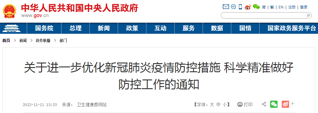 11月11日,國務(wù)院應(yīng)對新型冠狀病毒肺炎疫情聯(lián)防聯(lián)控機制綜合組發(fā)布了《關(guān)于進一步優(yōu)化新冠肺炎疫情防控措施,科學(xué)精準做好防控工作的通知》。