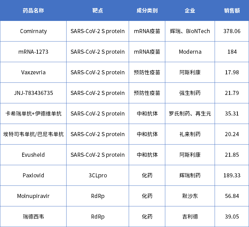 表1 新冠相關產品2022年度銷售額(單位:億美元)