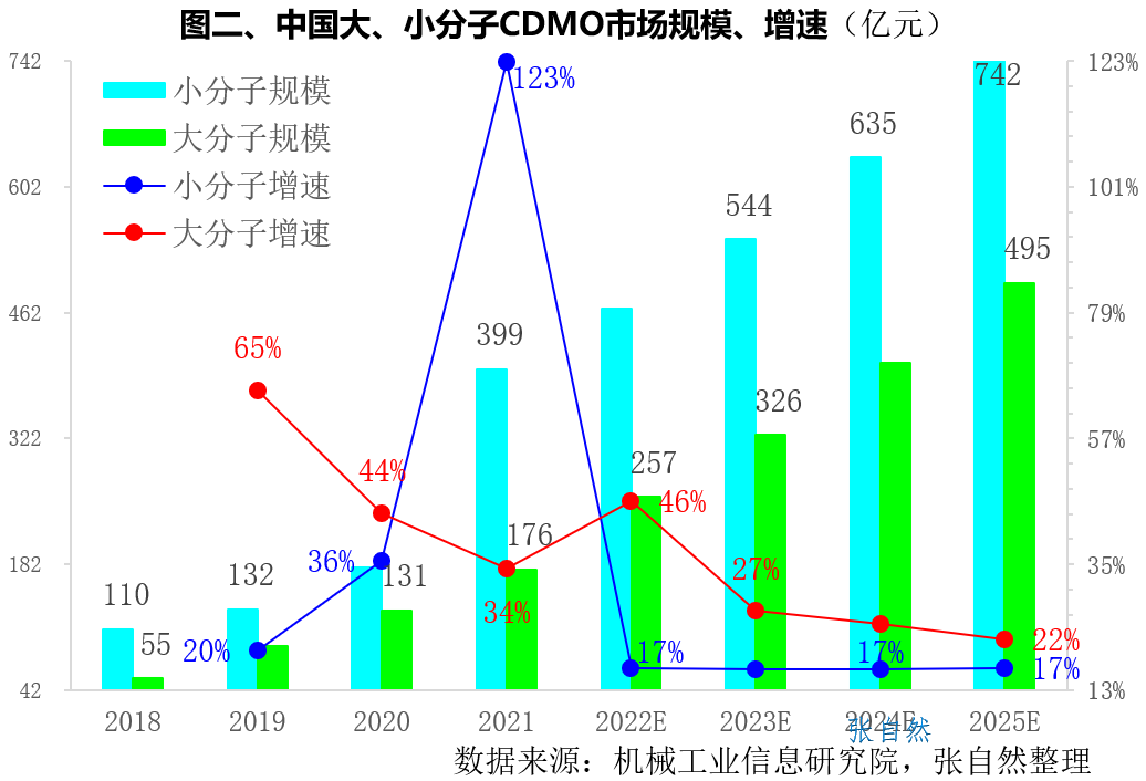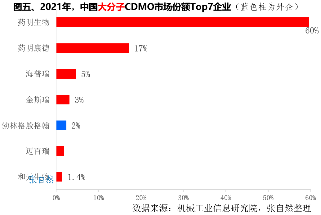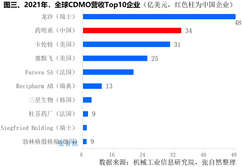 所謂CDMO,即定制研發(fā)生產(chǎn)機構(Contract Development and Manufacturing Organization),主要為藥企提供臨床新藥工藝開發(fā)和制備,以及為已上市藥物提供工藝優(yōu)化和規(guī)模化生產(chǎn)服務。CDMO產(chǎn)業(yè)在我國發(fā)展之迅猛可謂一時無兩,盡管近期資本市場有所波動,但優(yōu)勢尚存,增勢不減。目前,全球CDMO行業(yè)仍處于高速發(fā)展期,按沙利文統(tǒng)計口徑,全球CDMO市場規(guī)模由2017年的394億美元增長到了2021年的632 億美元,到2025年將達到1243億美元。2015年開啟的醫(yī)藥創(chuàng)新熱潮促進了我國CDMO產(chǎn)業(yè)的高速發(fā)展,我國CDMO市場規(guī)模由2017年的132億元增長到了2021年的473億元,4年增長了2.6倍,復合年增長率高達37.7%,2倍于同期全球CDMO18.5%的復合增長率,預計到2025年將達到1571億元。我國CDMO市場規(guī)模在全球的占比也由2017年的5%提高到了2021年的13%,到2025年將占到全球市場的1/5。(詳見圖一)小分子一直在我國CDMO產(chǎn)業(yè)占據(jù)主導地位,按機械工業(yè)信息研究院統(tǒng)計口徑,我國小分子CDMO市場規(guī)模由2018年的110億元增長到了2021年的399億元,3年增長了2.6倍,預計2025年將達到742億元。我國大分子CDMO的市場規(guī)模由2018年的55億元增加到了2021年的176億元,預計到2025年將增加到近500億元(495億元)。2018年到2021年,我國大分子CDMO的復合增長率為47.4%,稍低于小分子的53.6%。受益于細分領域的突破,2021年-2026年,大分子的復合增長率將達到27.3%,將遠高于同期小分子16.8%的復合增長率。(詳見圖二)2021年,全球CDMO營收最大的企業(yè)是瑞士龍沙和我國的藥明系(藥明康德+藥明生物)。在Top10企業(yè)中,歐洲占了6席,美國和亞洲各占2席。如按國家來劃分的話,瑞士、美國和法國各占2席,即瑞士的龍沙(48億美元,第1位)、Siegfried Holding(9億美元,第9位),美國的卡倫特(31億美元,第3位)、賽默飛(25億美元,第4位)和法國的Fareva SA(21億美元,第5位)、杜芬藥廠(9億美元,第8位)。另有4個國家各占1席,即中國的藥明系(34億美元,第2位)、瑞典的Recipharm AB(13億美元,第6位)、韓國的三星生物(10億美元,第7位)和德國的勃林格殷格翰(9億美元,第10位)。(詳見圖三)2021年,在我國小分子CDMO市場份額Top10企業(yè)中,竟有4家來自同一個省的同一個地級市--浙江省臺州市,即九洲藥業(yè)、普洛藥業(yè)、聯(lián)盛科技和天宇股份,皆因臺州是我國乃至全球最重要的化學原料藥基地,知名原料藥企業(yè)海正、華海、司太立和海翔藥業(yè)等均位于臺州。帶量采購導致的藥價下降大大促進了藥品使用量的提升,原料藥的消耗量也隨之大幅增加,同時也推動了原料藥企業(yè)向下游制劑環(huán)節(jié)的延伸。臺州作為原料藥基地,在帶量采購背景下,其成本和技術優(yōu)勢凸顯,從而實現(xiàn)了產(chǎn)業(yè)鏈的延伸和產(chǎn)業(yè)升級。在小分子市場份額Top10企業(yè)中,市場份額最大的是藥明康德(占了35%)。其次是后起之秀凱萊英(占11%),2022年前9個月,凱萊英營收同比增長高達167%,傲視群雄,歸母凈利增速更是高達292%。其后分別是博騰股份(8%)、康龍化成(4.4%)和圣諾生物(1.6%)。(詳見圖四)我國小分子CDMO企業(yè)格局相對穩(wěn)定,大分子CDMO企業(yè)集中度高企。2021年,大分子CDMO市場份額最大的企業(yè)是藥明系(藥明生物+藥明康德),占了近8成市場(77%)。其次是金斯瑞(3%)、邁百瑞(1.8%)和和元生物(1.4%)。在Top企業(yè)中還有一家外企,即德國的勃林格殷格翰,占了2%的市場,如勃林格殷格翰為上海之江生物的新冠雙特異性抗體藥物SYZJ001提供工藝優(yōu)化及生產(chǎn)制造服務。(詳見圖五)國內(nèi)CDMO企業(yè)多服務于臨床階段的工藝開發(fā)和研究,因此需要大量的研發(fā)人員,如藥明生物、凱萊英等企業(yè)的研發(fā)人員數(shù)量占到了員工總數(shù)的40%以上,工程師紅利促進了我國CDMO產(chǎn)業(yè)的高速發(fā)展。2020年,全球重點CDMO企業(yè)中,人工成本最低的是我國的凱萊英,其單位人工成本為2.4萬美元/人,只有瑞士Siegfried Holding(12.4萬美元/人)的不到1/5。其次是我國的博騰股份(2.8萬美元/人)和藥明康德(3萬美元/人)也都遠低于瑞士龍沙的11.8萬美元/人、韓國三星生物的8.1萬美元/人。