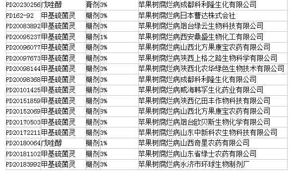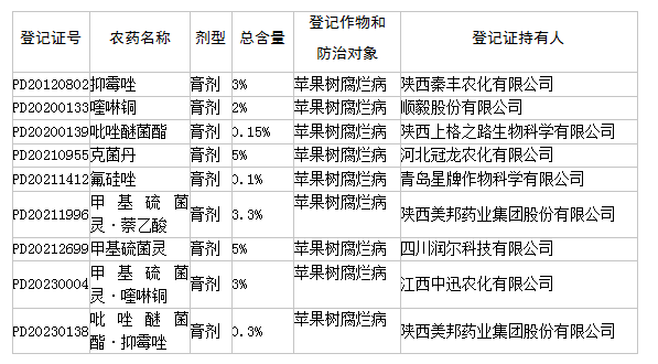 目前我國批準登記的膏劑(糊劑),主要為殺菌劑、植物生長調(diào)節(jié)劑,個別為衛(wèi)生殺蟲劑。截至2023年5月10日,我國批準登記并處于有效狀態(tài)的殺菌劑膏劑(糊劑)產(chǎn)品共25個,其中膏劑10個,糊劑15個,涉及甲基硫菌靈(17個)、戊唑醇(2個)、抑霉唑(2個)、喹啉銅(2個)、吡唑醚菌酯(2個)、克菌丹(1個)、氟硅唑(1個)、萘乙酸(1個)等8種有效成分,登記作物和防治對象均為蘋果樹腐爛病。具體登記信息如下: