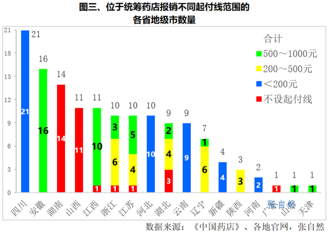 可見,湖南和山西政策最友好,其屬下地級市都不設起付線,四川、河北、云南、新疆和河南的也不錯,所轄各市的起付線均在200元以下。(詳見圖三)