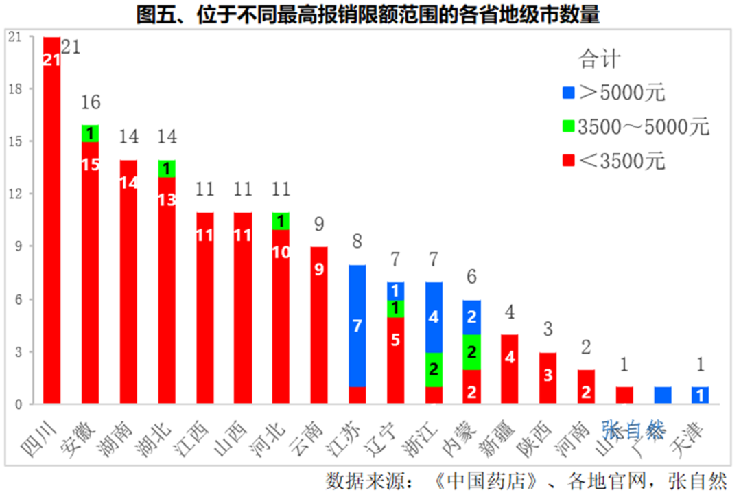 起付線<200元的占了1/3,涉及5省的46個地級市,即四川(21個市)、河北(10個市)、云南(9個市)等;