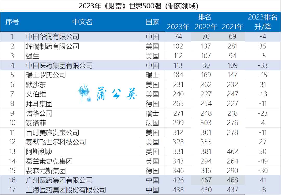 8月2日,2023年《財富》世界500強榜單發布,17家制藥公司上榜,其中,4家中國藥企榜上有名:中國華潤有限公司、中國醫藥集團有限公司、廣州醫藥集團有限公司、上海醫藥集團股份有限公司榜上有名。廣藥集團排名上升最快:廣藥集團連續第三年上榜,排名年年上升,今年位居第426位,比去年排名躍升41位,已經連續兩年在榜且排名穩步上升。 中國醫藥集團有限公司:113名,比去年下降33名; 上海醫藥集團股份有限公司:438名,比去年下降了8名。 上榜的跨國公司:第102位,輝瑞;第112位,強生;第184位,羅氏;第231位,默沙東;第240位,艾伯維;第265位,拜耳;第271位,諾華;第299位,賽諾菲;第312位,百時美施貴寶;第328位,賽默飛;第331位,阿斯利康;第343位,葛蘭素史克;第346位 費森尤斯。輝瑞,成為全球最大的制藥公司:輝瑞制藥有限公司排名上升35位至第102位,成為全球最大的制藥公司,利潤為31,372百萬美元。中美差距明顯:以輝瑞為代表的10家美國制藥企業,平均銷售收入982億美元,平均利潤114億美元。上榜中國企業中被納入藥企行業只有中國醫藥和廣州醫藥兩家企業。這兩家企業平均銷售收入647億美元,平均利潤7.1億美元。兩項指標遠遠低于美國企業。利潤如此之低,企業難以投入足夠資金用于創新。生物醫藥行業是關系人類未來發展的行業。上榜中國企業與美國企業的差距表明,我們還有很長的路要走。