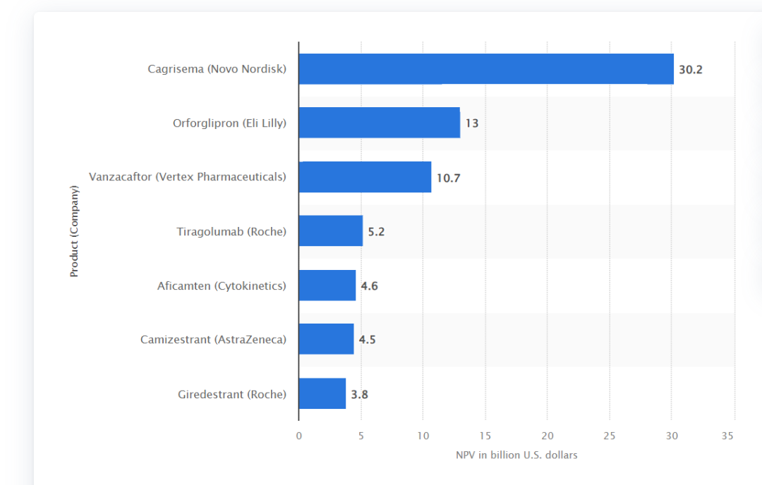 與Evaluate Pharma的榜單類似,Statista的管線資產中NPV最高的項目同樣是諾和諾德的CagriSema,但比Evaluate的估值更高,為302億美元。
