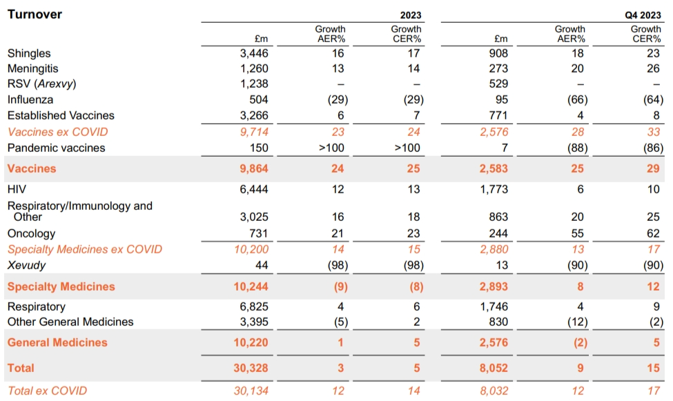 Arexvy作為全球首款RSV疫苗,自2023年5月3日獲批上市后首季度(Q3)銷售額就高達(dá)7.09億英鎊,單季度銷售額僅略低于明星產(chǎn)品帶狀皰疹疫苗Shingtix。目前,葛蘭素史克對(duì)Arexvy的全年銷售指導(dǎo)范圍為9億至10億英鎊。