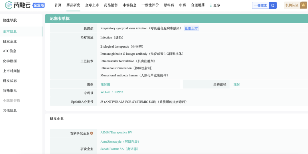 Nirsevimab相關(guān)專利:WO-2015108967。最早由荷蘭AIMM Therapeutics BV開發(fā);于2012年授權(quán)予MedImmune/阿斯利康。2017年3月,賽諾菲Pasteur與MedImmune/阿斯利康達(dá)成共同合作開發(fā)協(xié)議。
