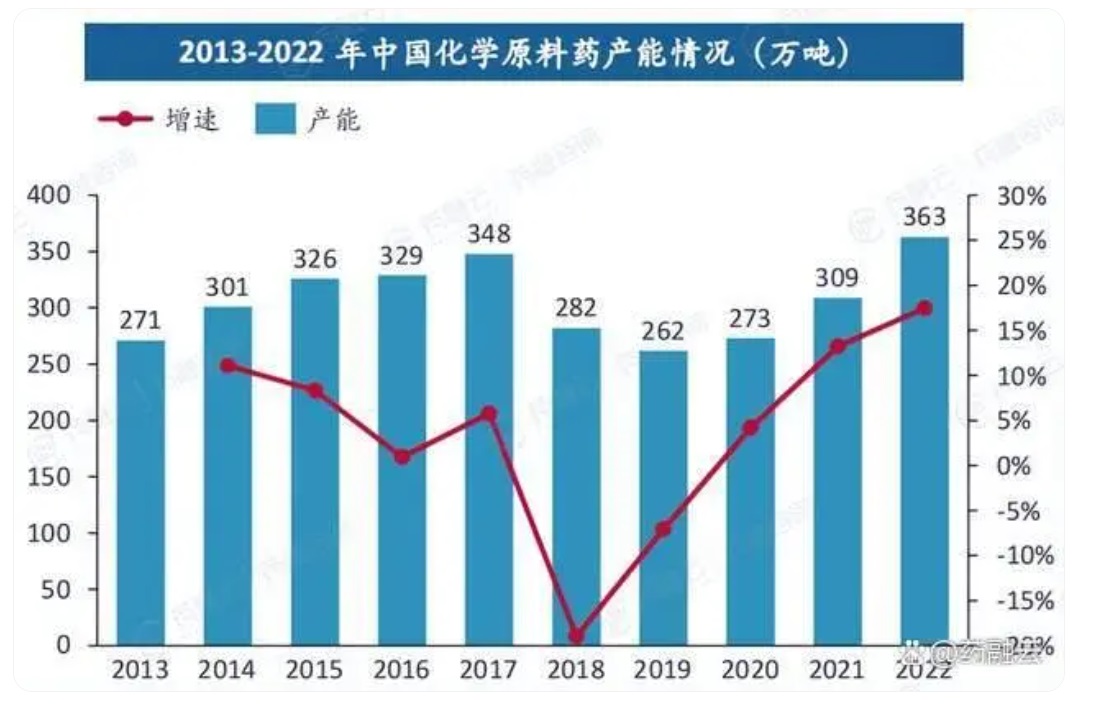 國內原料藥市場也呈現出相似的趨勢。在2013-2017年間中國原料藥的產能整體呈增長趨勢;但在2018-2019年受環保安全監管趨嚴以及供給改革不斷深化的影響,一些高能耗、高污染、工藝技術落后、過剩的原料藥產能被淘汰,中國原料藥產能下降明顯;2020年我國原料藥市場開始恢復增長,但受疫情影響,增長緩慢,增速僅約為4.2%;從2021年開始增長速度加快,相比2020年增速約為13.2%;2022年中國原料藥產能已超過了2017年時最高產能,相比2021年增速約為17.5%。