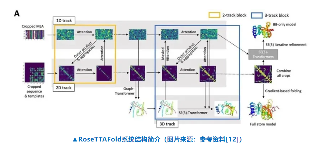 2003年,Baker的團隊設(shè)計出了第一個原本并不存在于自然界中的蛋白質(zhì),它被命名為Top7。這當然是一個重要突破,但卻沒有開辟一個嶄新的時代。Baker實驗室的成員開玩笑說Top7只是一塊從熱力學角度上看很穩(wěn)定的“石頭”。因為他們從頭設(shè)計出的這個蛋白質(zhì)雖然折疊成了研究人員們想要它折疊的模樣,但不具有任何功能。7年后,Baker的一名博士后研究員做出了改進。他將抗體的一部分連接到了人造蛋白上,使人造蛋白首度具有了功能:新合成的蛋白能識別流感病毒,有望成為一種新的藥物,但這多少有些“作弊”的意思,畢竟最重要的那部分來自天然的抗體。接下來的幾年時間,Baker的團隊對Rosetta進行了更多的優(yōu)化。如今,Baker的實驗室,以及他的合作伙伴們已能設(shè)計出多種不同的蛋白,有朝一日,人類完全獲得“上帝之手”的能力將不再是夢想。不過到目前,從頭設(shè)計蛋白依然是一個不斷試錯的工作,需要大量的資源投入。以設(shè)計結(jié)合蛋白為例,從流程上看,科學家會首先用Rosetta模擬出所感興趣蛋白表面上的一個“口袋”,然后再設(shè)計出大量不同的螺旋結(jié)構(gòu),形成穩(wěn)定骨架。這些骨架上含有一些特定的氨基酸,有可能會與“口袋”進行完美的契合。這個工作就像是在一把鑰匙上不斷打磨,最終使其完美地對應(yīng)一把鎖。隨后,研究人員們會根據(jù)設(shè)計合成所要的DNA序列,將其引入細菌細胞,期望它們能夠產(chǎn)生所需要的蛋白。獲取這些蛋白后,他們還會做兩個測試:評估這些蛋白是否能如預(yù)期般折疊,以及折疊后的蛋白是否能如預(yù)期般結(jié)合特定蛋白。通常來講,人工設(shè)計的蛋白極少能同時滿足這兩個條件。而那些脫穎而出的蛋白,則會成為新一輪設(shè)計與篩選的起點,直至獲得最佳的構(gòu)象。在2018年以前,Baker及其團隊開發(fā)的Rosetta在蛋白質(zhì)結(jié)構(gòu)預(yù)測領(lǐng)域完全沒有對手。而那一年,AlphaFold的出現(xiàn)令Baker嗅到了危機。盡管18年的蛋白質(zhì)結(jié)構(gòu)預(yù)測競賽依然是Rosetta拔得頭籌,但首次亮相就獲得了第二名的AlphaFold令Baker見識到了機器學習的過人之處。于是,他要求團隊緊跟時代的風向,加緊研究機器學習。Baker的預(yù)感沒有錯,在2020年的競賽中,第二代AlphaFold擊敗了Rosetta,一舉成名。不過,Baker率領(lǐng)著團隊很快就追趕了上來。2021年7月15日,當DeepMind公司在《自然》雜志上發(fā)表論文,公開了“AlphaFold2”的源代碼,并且詳細描述了它的設(shè)計框架和訓(xùn)練方法時,Baker的團隊也于《科學》雜志上介紹了其開發(fā)的RoseTTAFold算法。RoseTTAFold的神經(jīng)網(wǎng)絡(luò)能夠同時考慮蛋白序列的模式、蛋白中不同氨基酸之間的相互作用,以及蛋白質(zhì)可能出現(xiàn)的3D結(jié)構(gòu)。在這個系統(tǒng)中,一維、二維和三維的信息能夠相互交流,讓神經(jīng)網(wǎng)絡(luò)綜合所有信息,決定蛋白質(zhì)的化學組成部分和它折疊產(chǎn)生的結(jié)構(gòu)之間的關(guān)系。