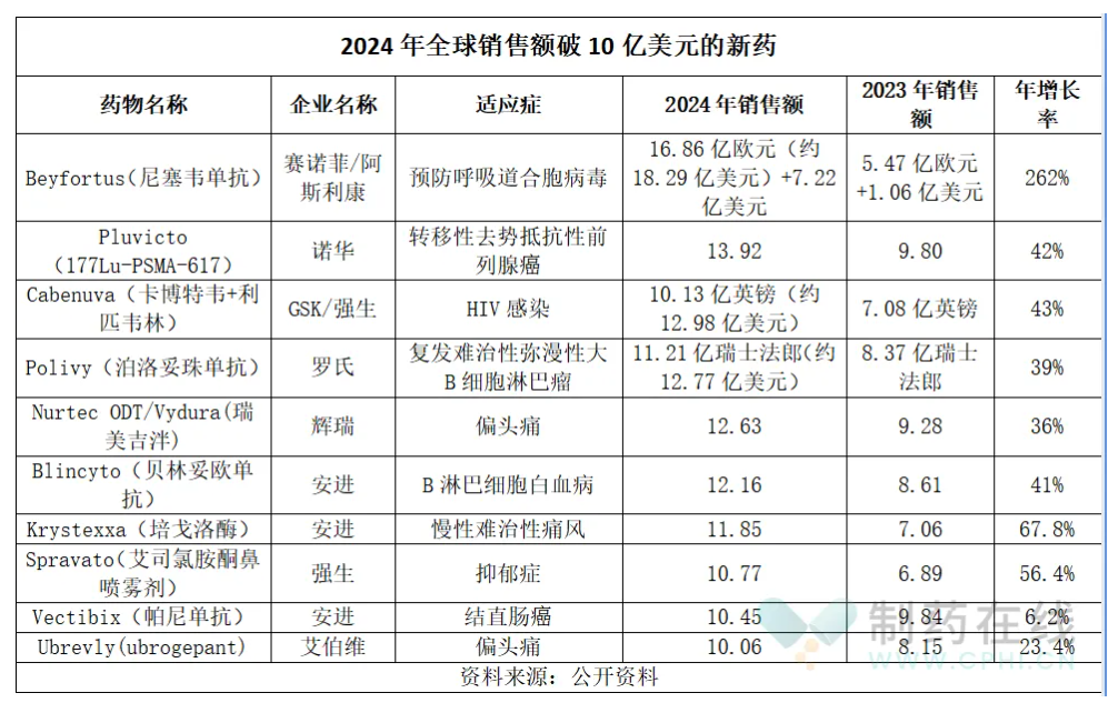 隨著MNC財報的公布,2024年首次進入重磅行列的新藥也逐漸顯現。據不完全統計,2024年10款新藥全球銷售額首次突破10億美元,其中安進占據3款。適應癥上,4款用于腫瘤,2款用于治療偏頭痛,其中治療偏頭痛的2款藥物均屬于口服降鈣素基因相關肽(CGRP)受體拮抗劑。藥物類型上,單抗和化藥各占據4款,核藥1款,酶類1款。年增長率上,Beyfortus增長較快,銷售額較2023年翻倍。